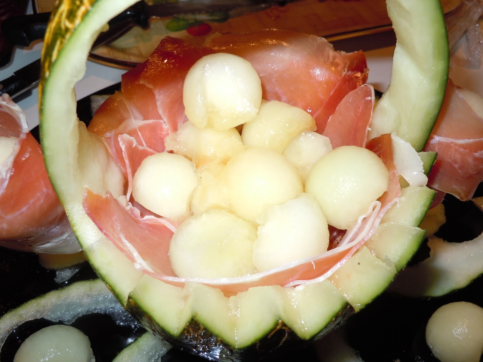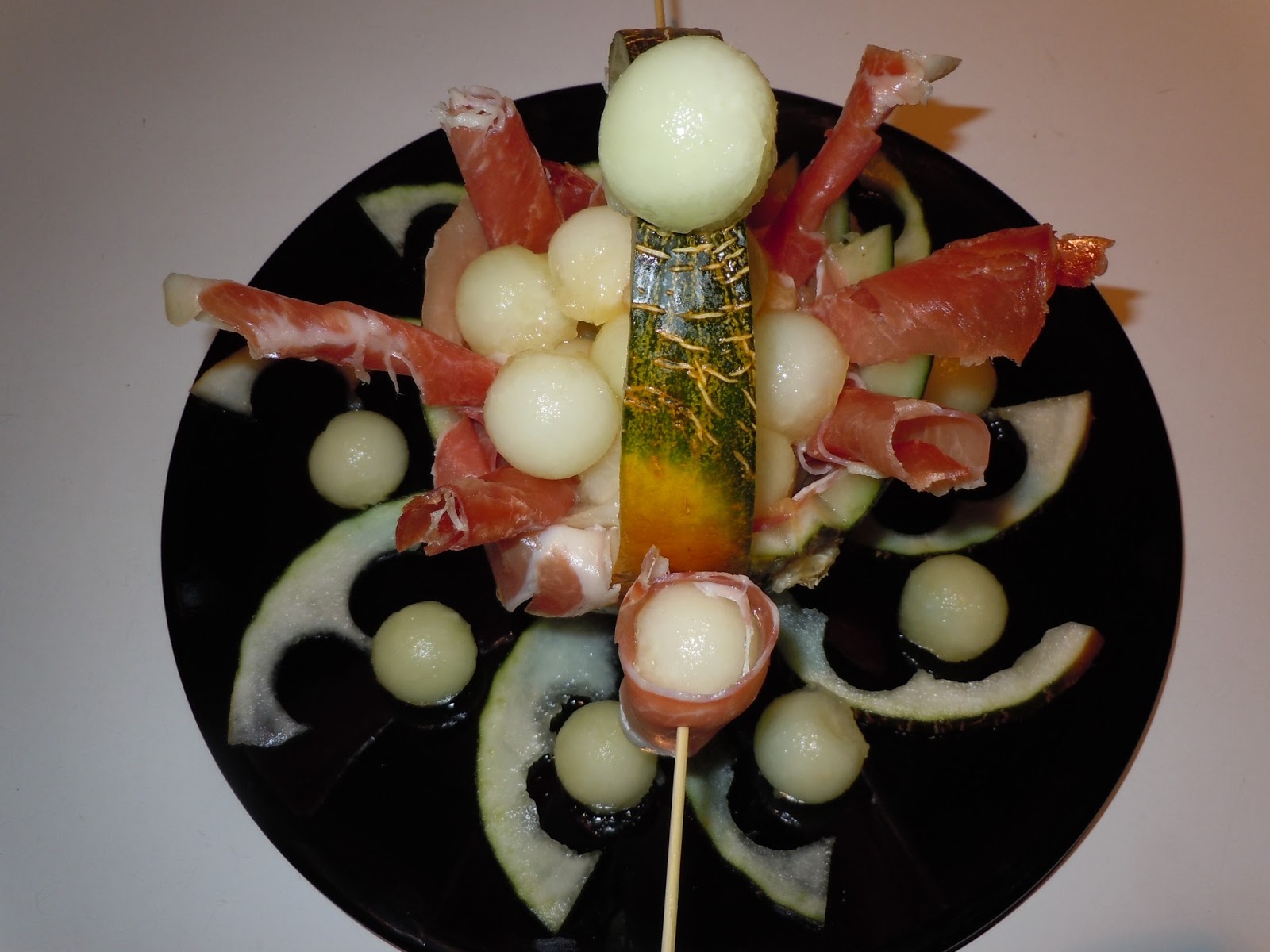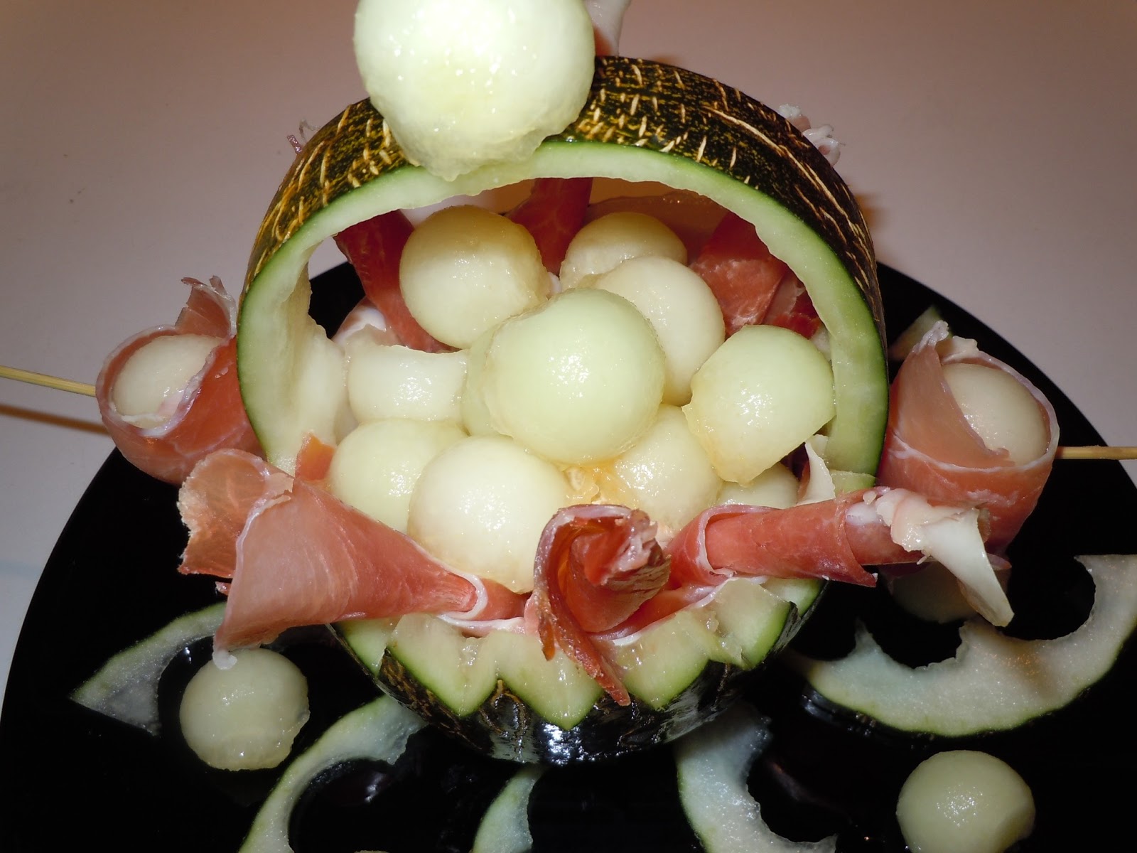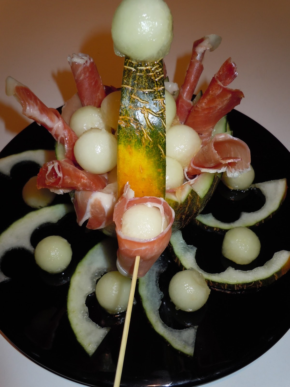 Enrollamos alguna bola de melón con jamón y pinchamos por la cascara.