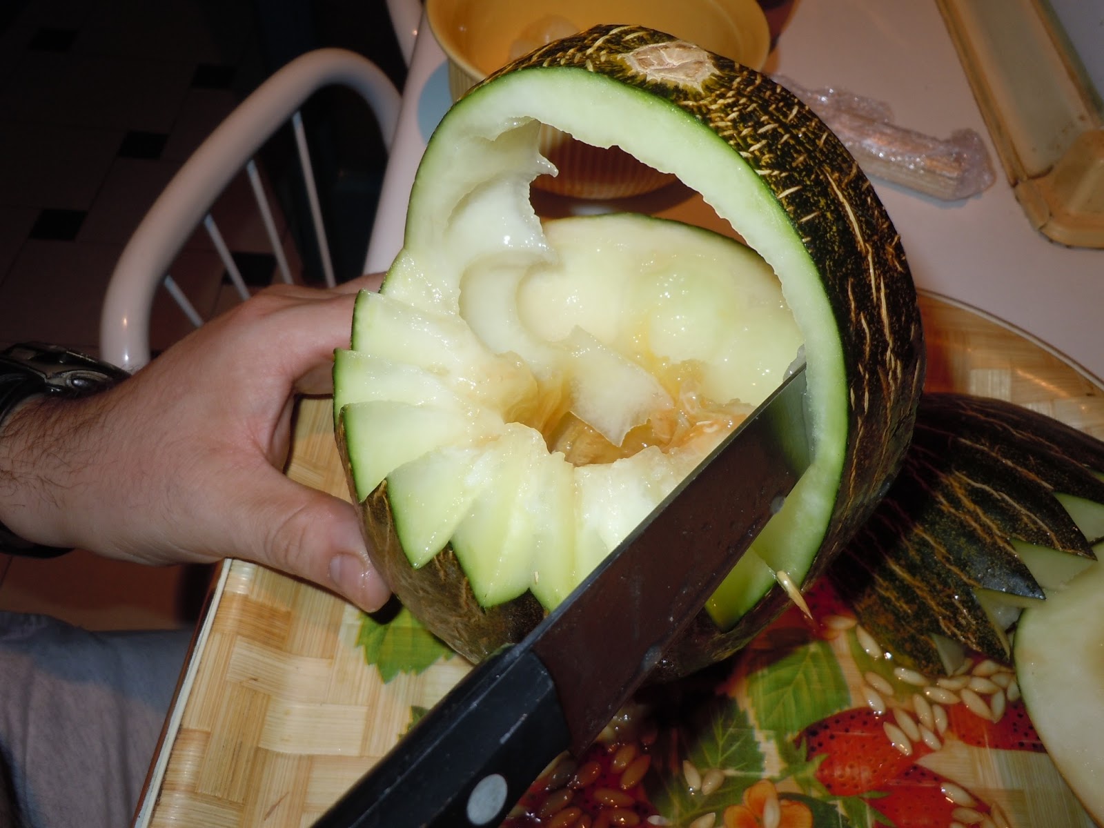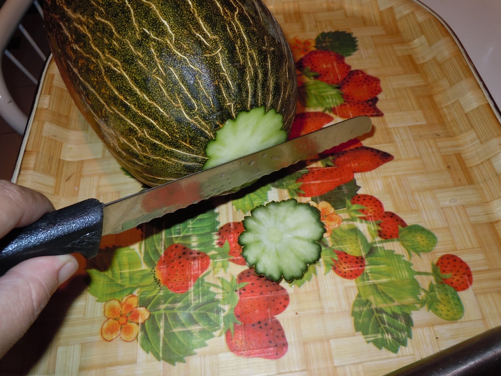 También recortamos la carne de melón que esta en el asa de la cesta.(esta seria la decoración en zig-zag ,queda super chula).