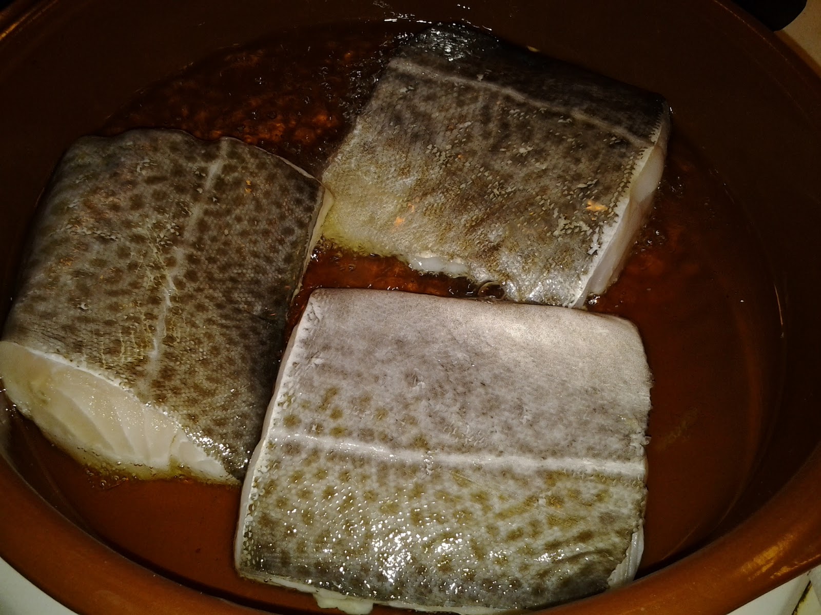 Después le damos la vuelta con cuidado de no romper los lomos de bacalao.Retiramos del fuego y dejamos templar el aceite.