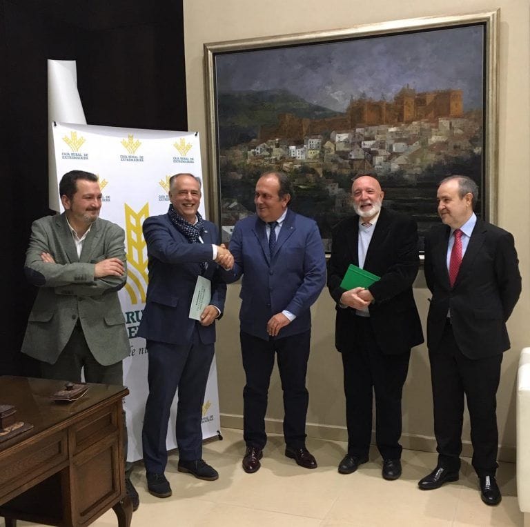 El presidente de Caja Rural de Extremadura, Urbano Caballo, y el presidente del Colegio de Ingenieros Técnicos Agrícolas de Badajoz y Director de la Escuela
