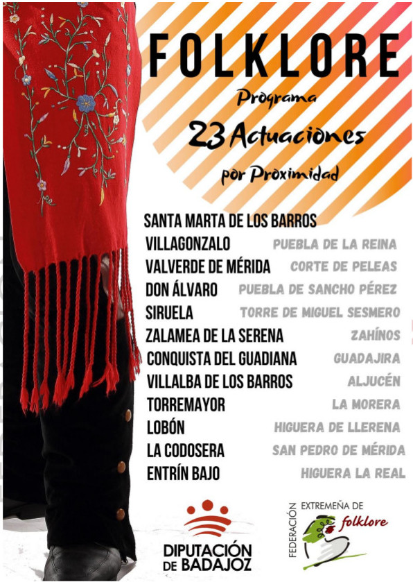 Los programas y festivales enfocados a la difusión y potenciación del folklore extremeño son el autonómico de folklore “Bonifacio Gil”, las denominadas “Actuaciones de Proximidad” de la provincia de Badajoz, los talleres que definen “Enraizarte”, el festival para la inclusión “Romero y Espinosa” y “Folklórico de los Pueblos del Mundo”.