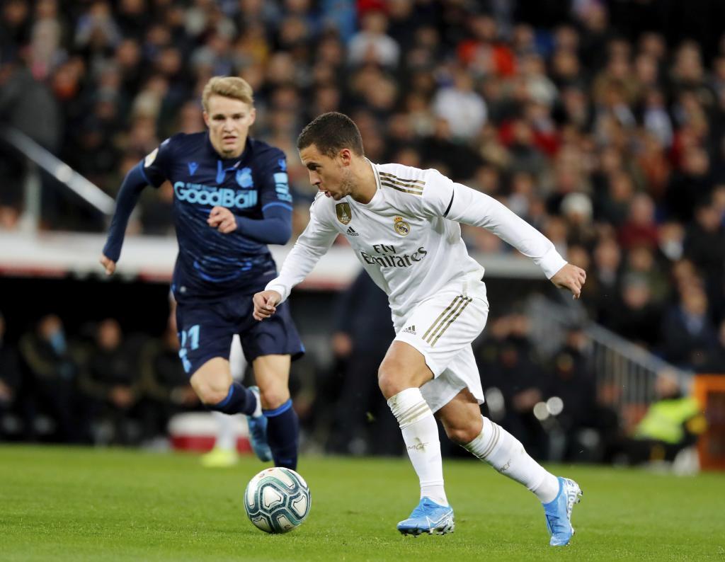 Real Madrid Cada vez regatea más y ante la Real llegó a 10 Hazard encara la portería ante la presencia de Odegaard RAFA CASAL Que cada