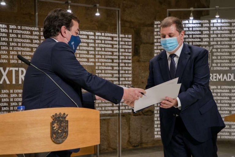 El presidente de la Junta de Extremadura, Guillermo Fernández Vara, y el presidente de la Sociedad Estatal Correos y Telégrafos, Juan Manuel Serrano Quintana, han