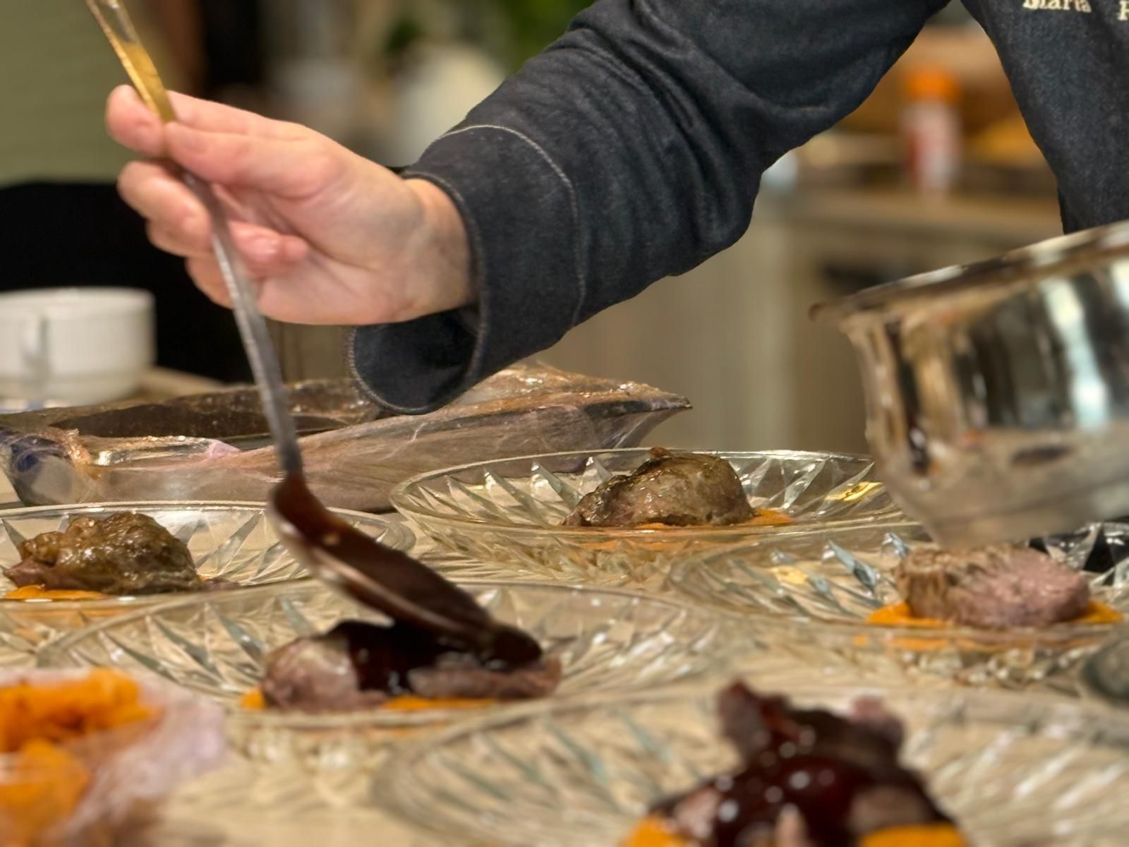 “Un menú degustación mío tiene que recordar a la zona. Visual, emocional… algo que te lleve a la matanza, por ejemplo. Y terminar con sapillos, claro. O mi tarta de queso, que está empezando a coger fama —ríe—. Y la tarta de crema y hojaldre, que es tradición pura de este pueblo”.