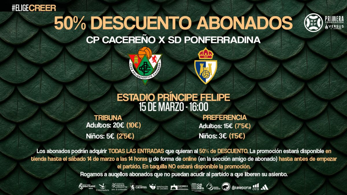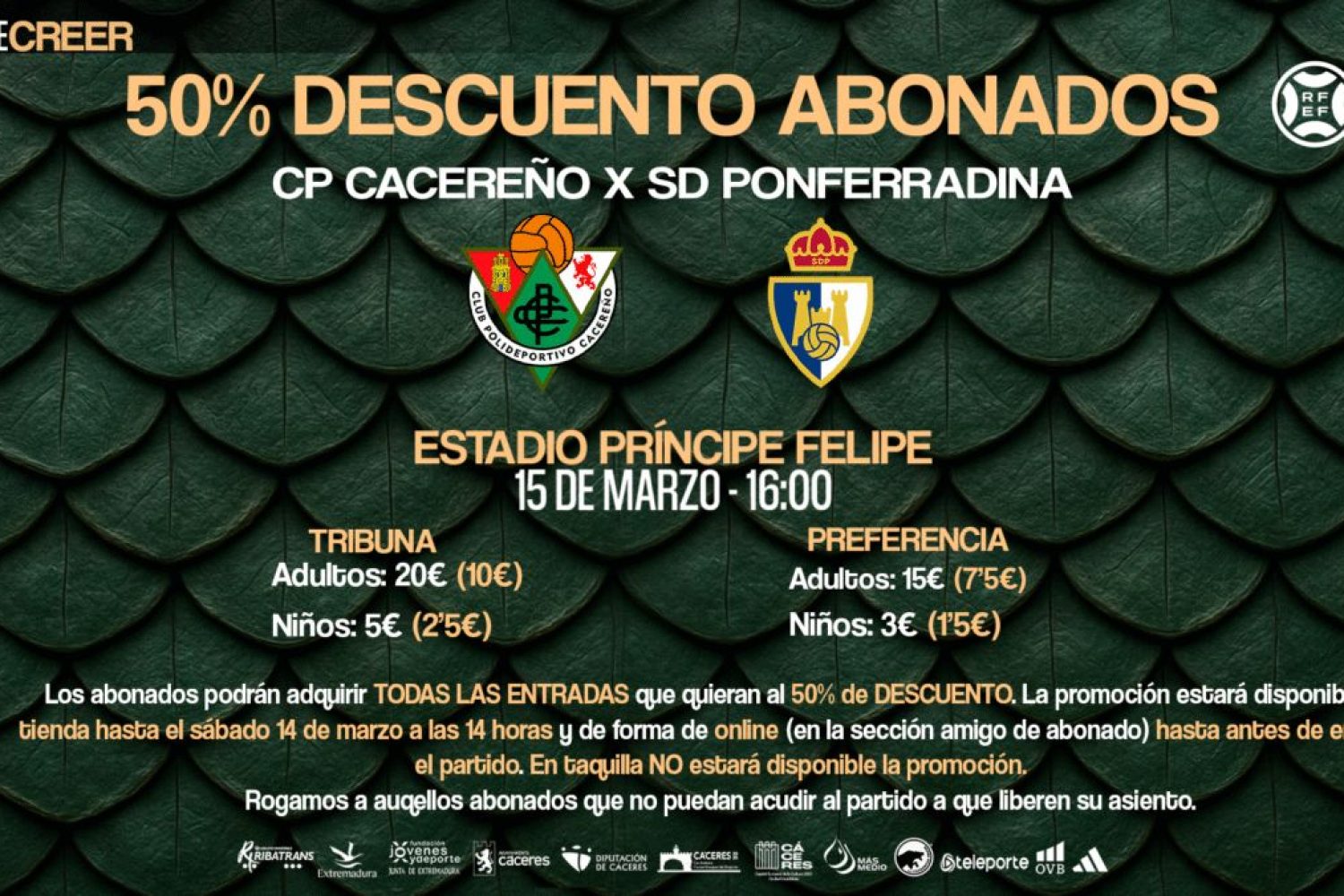 El CP Cacereño ha anunciado una promoción especial para uno de los partidos importantes de la temporada. Los abonados del club podrán adquirir entradas con un 50% de descuento para el encuentro frente a la SD Ponferradina, que se disputará el domingo 15 de marzo a las 1:00 horas en el Estadio Príncipe Felipe.