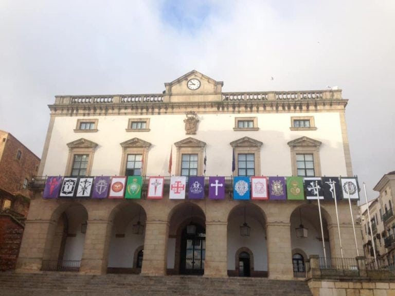 El balcón principal del Ayuntamiento de Cáceres ya luce los estandartes de las 17 cofradías que forman parte de la Semana Santa de la ciudad. Las imágenes permanecerán expuestas